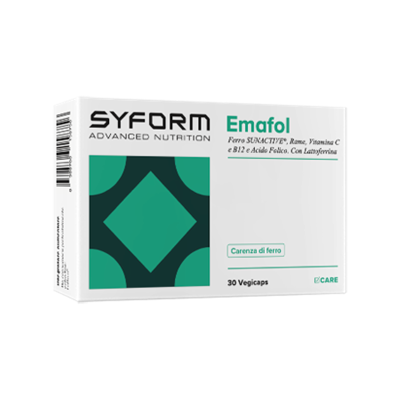 Emafol è un integratore alimentare a base di Ferro, Vitamina C e B12, Rame e Acido Folico indicato in caso...