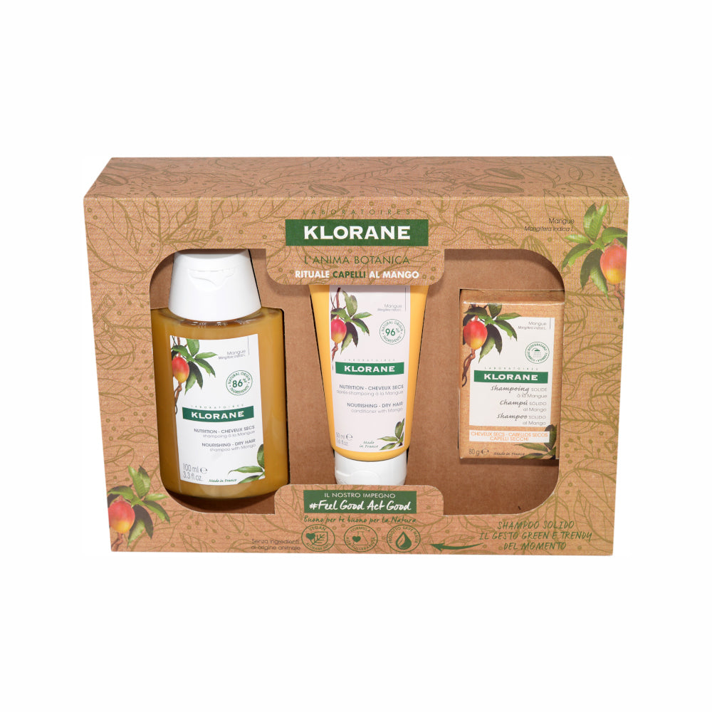 Klorane Cofanetto Rituale Capelli Secchi al Mango Shampoo 100ml + Balsamo 50ml + Shampoo Solido 80g