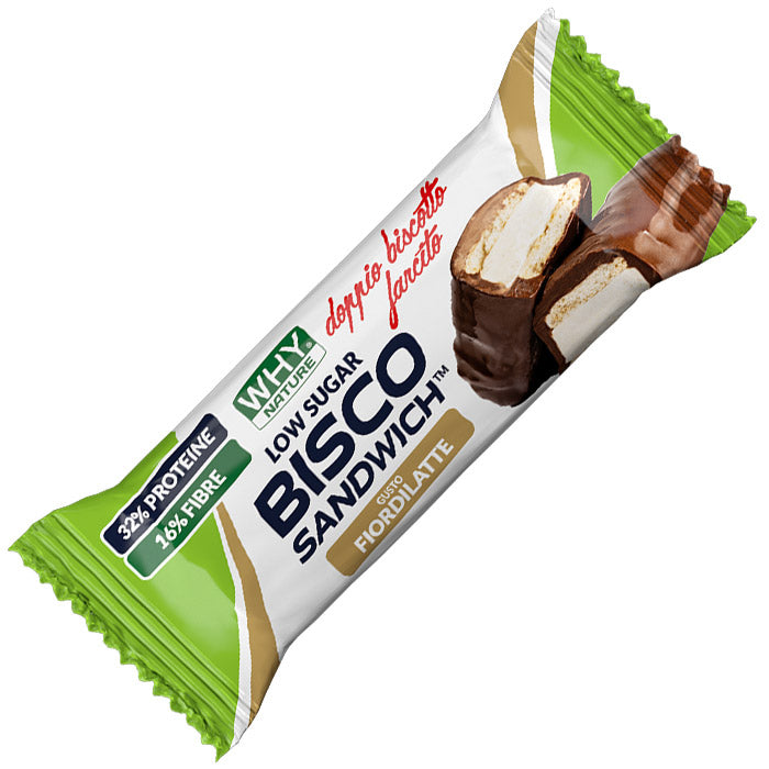 BISCO SANDWICH Doppio biscotto proteico con ripieno aromatizzato al cocco e copertura al gusto cioccolato fondente con cocco rapè. Con...