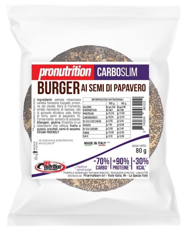 pronutrition CARBOSLIM BURGER Descrizione Burger ai semi di papavero. Ingredienti Semola rimacina varietà Senatore Cappelli, proteine del pisello, fibra di...