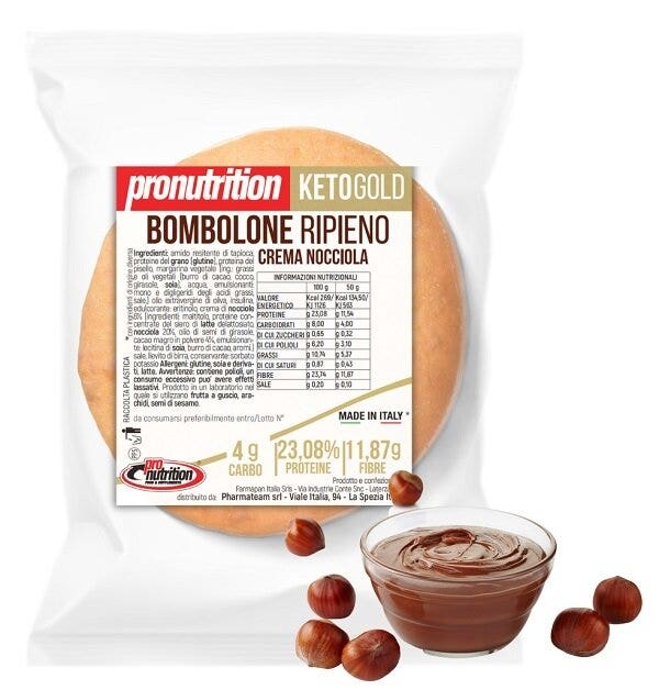 pronutrition KETOGOLD BOMBOLONE RIPIENO Descrizione Bombolone ripieno con crema alla nocciola. Ingredienti Amido resistente di tapioca, proteine del grano (glutine),...