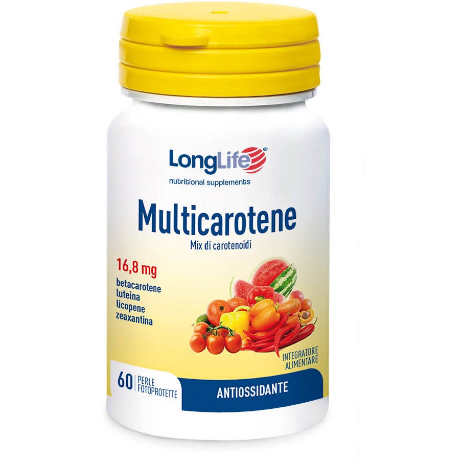 Longlife MulticaroteneIntegratore di carotenoidi.Senza Glutine.Ingredientiolio di girasole, sospensione oleosa di pomodoro Solanum lycopersicum titolata 6% licopene, alga D. salina titolata...