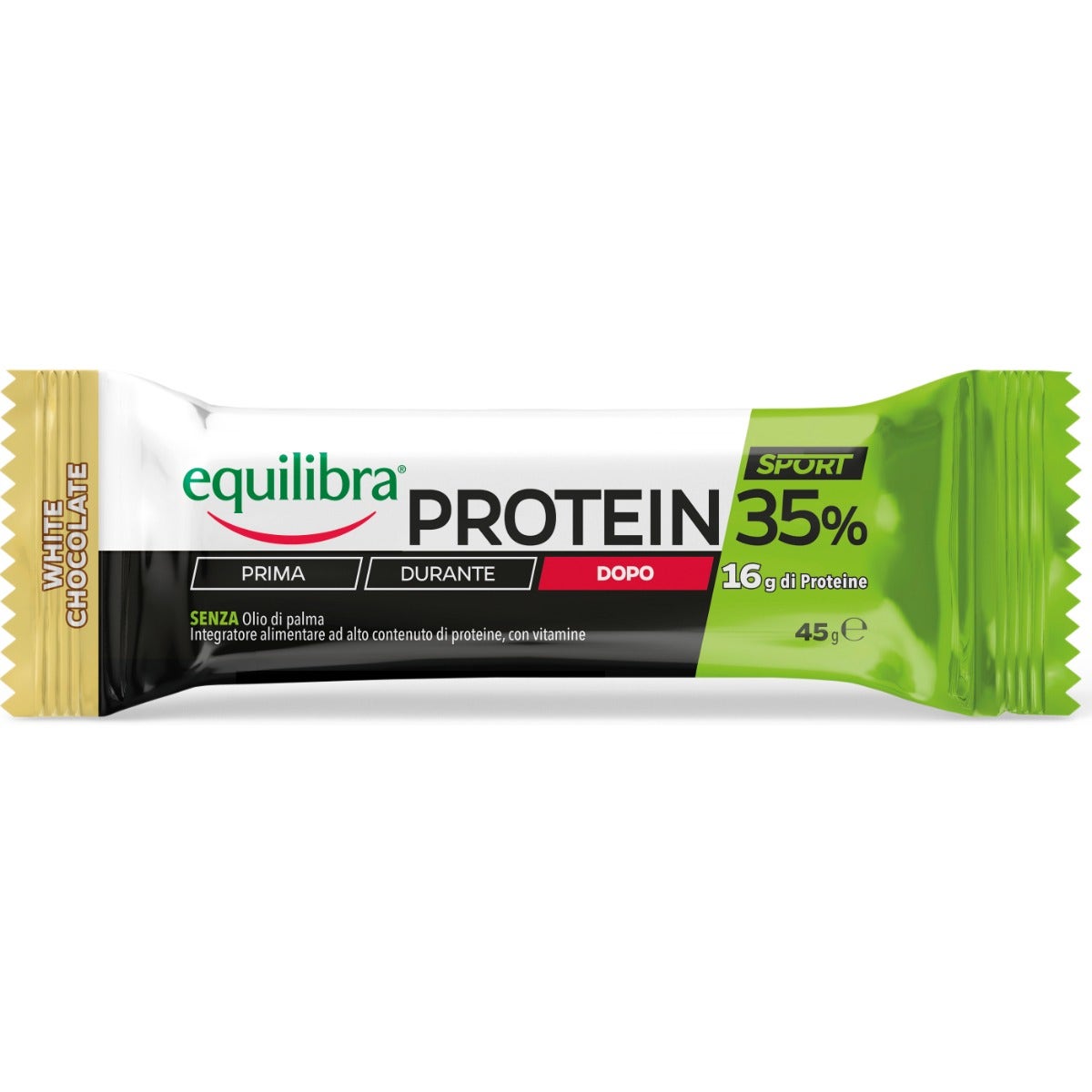 Barretta Protein 35% white chocolate Equilibra è un integratore alimentare ad alto contenuto di proteine, con vitamine.